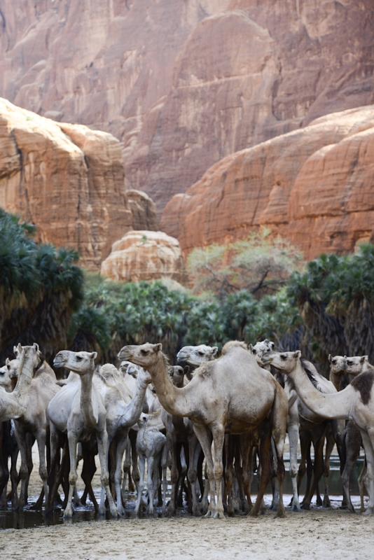 Dromedaries inside one of the gorges with water of the Ennedi plateau. Ennedi Natural and Cultural Reserve (World Heritage, UNESCO).